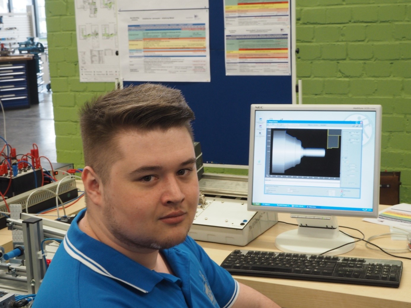 Lars Sachsse, Auszubildender der Firma Neumann & Esser, stellt sein CNC-Programm zum aktuellen Projekt am BKE vor.