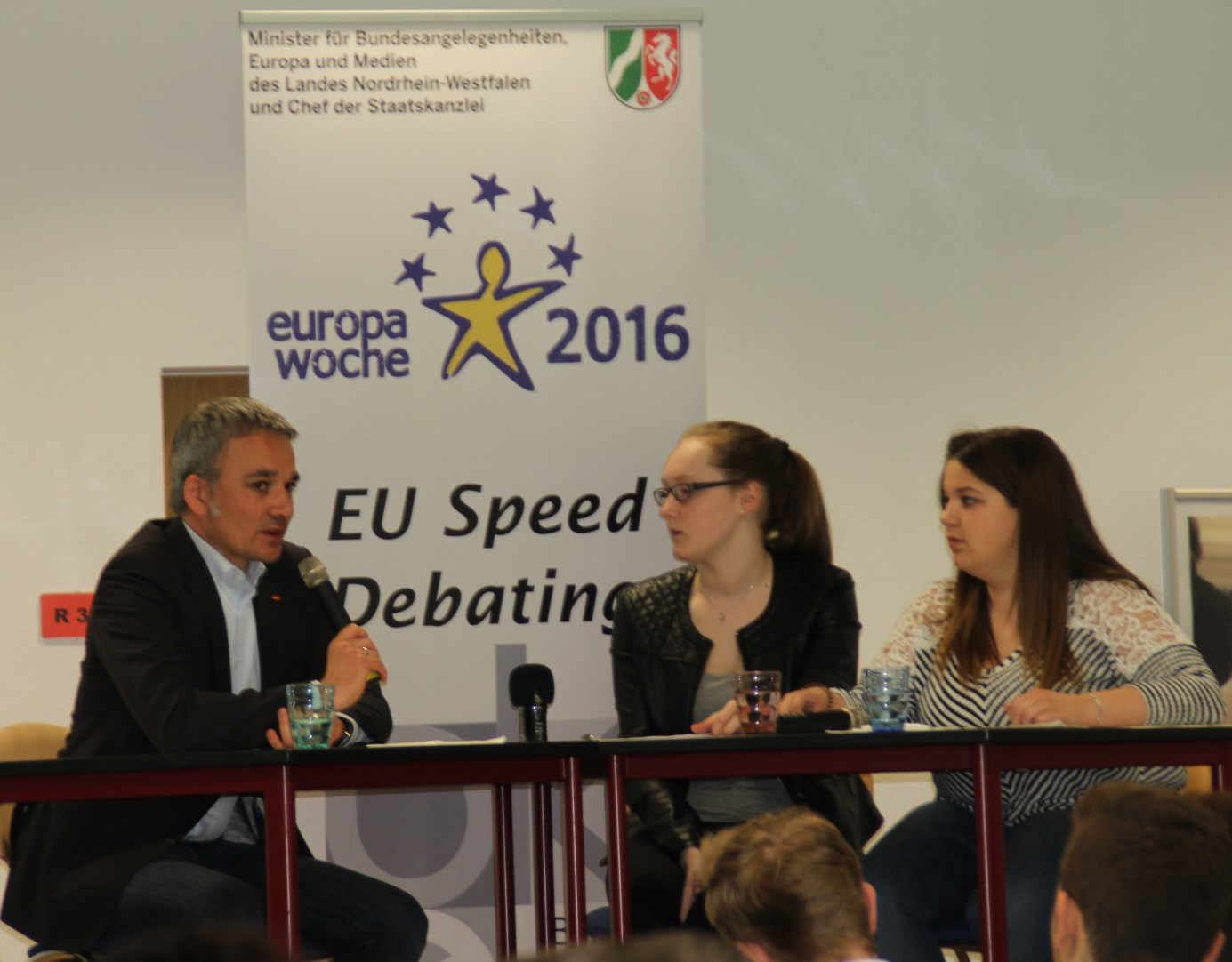 Die Schülerinnen und Schüler des Beruflichen Gymnasiums hatten sich gut vorbereitet und gingen in eine intensive Auseinandersetzung über Themen zur fehlenden Solidarität in Europa, zu den Gefahren der belgischen Atommeiler in Grenznähe oder zu Rechtspopulismus und Europaabkehr in Polen. Kernstück in beiden Veranstaltungen war jedoch die Situation der jungen Flüchtlinge im Kreis Heinsberg. Und da haben die Schüler des Wirtschaftsgymnasiums zuvor im eigenen Haus an den Türen der Internationalen Förderklassen geklopft und die überwiegend aus Syrien stammenden Flüchtlinge zu ihrer Situation und den Erwartungen in Deutschland befragt. Die Interviews lösten per Videoclip den Startschuss zu einer kritischen und an den Grundwerten der Verfassung orientierten Debatte aus. Doch Debatte ist nicht gleich Debatte. Hier hatten sich die beiden verantwortlichen Politiklehrer des BKE, Verena Gahr und Dr. Uwe Bilski, ein neues Debattenformat überlegt, dass sie kurz „Speed Debating“ nennen. Kurzweilig, mit festen Redezeiten für alle, angelehnt an „Jugend debattiert“, so standen die Schüler einem Politiker gegenüber, um dessen Verständnis der EU auf den Prüfstand zu stellen.