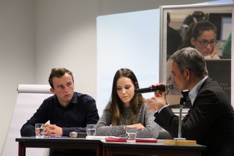 IMG_6298: Julie Kranz und Marius Major debatieren mit Wilfried Oellers, MdB