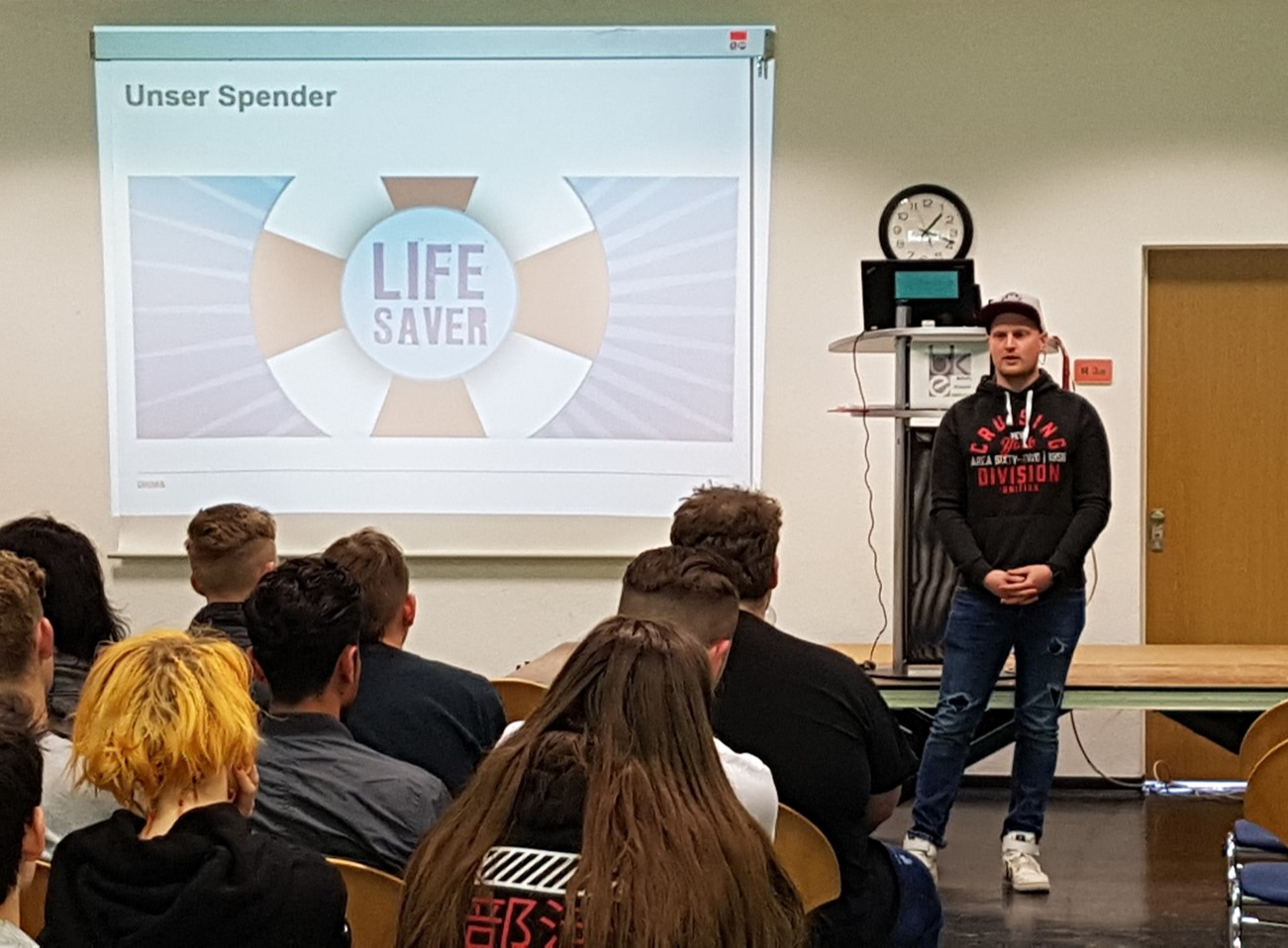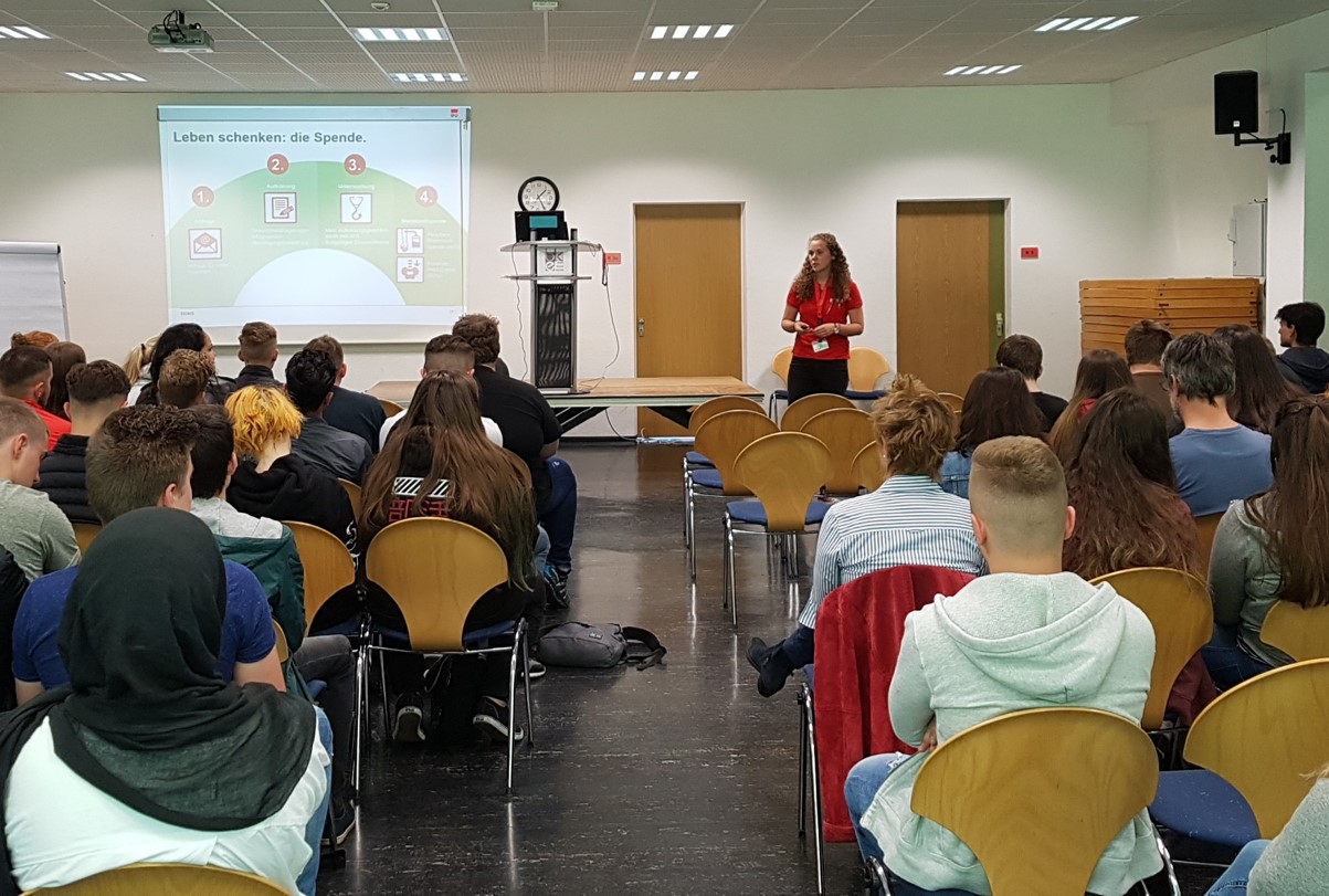 An den beiden Tagen haben rund 60 Klassen an den Informationsveranstaltungen teilgenommen, die die DKMS durchgeführt hat. Dabei wurden den Schülerinnen und Schülern erklärt, was Blutkrebs ist und wie man betroffenen Patienten helfen kann, nämlich mit einer Knochenmarkspende. Um den Schülerinnen und Schülern dieses Thema näher zu bringen, hat die DKMS einen jungen Spender mitgebracht, der von seinen Erfahrungen mit einer solchen Knochenmarkspende berichtet hat. Dies hat die Zuhörer besonders interessiert, weil das Thema damit ein Gesicht bekommen hat und die Möglichket bestand, die Fragen direkt jemandem zu stellen, der diese aus der Praxis beantworten kann. Hier standen besonders Fragen zum Empfänger der Knochenmarkspende im Mittelpunkt, mit dem der Spender regelmäßig Kontakt auch, auch wenn der Empfänger in den USA lebt.