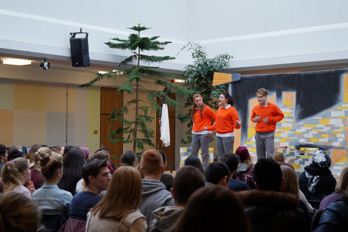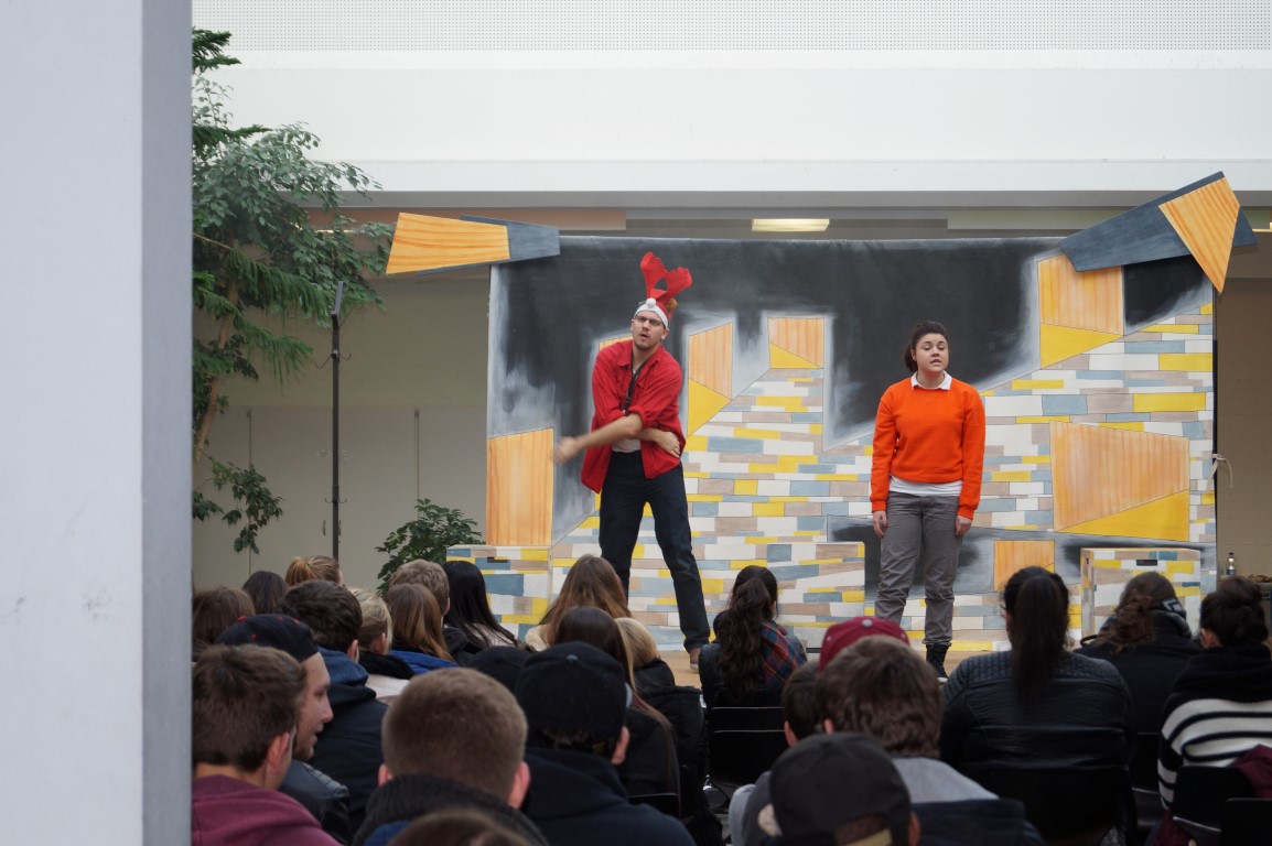 Besonders hervorgehoben wurde durch die Schülerinnen und Schüler jedoch der enge persönliche Kontakt zu den Schauspielern. Bereits vor Beginn der Vorstellung suchten diese den direkten Kontakt zu unseren Schülerinnen und Schülern, um sie so auf das kommende Stück einzustimmen. Das Eis war schnell gebrochen und die Bereitschaft, sich auf das fremdsprachige Abenteuer einzulassen, vorhanden.