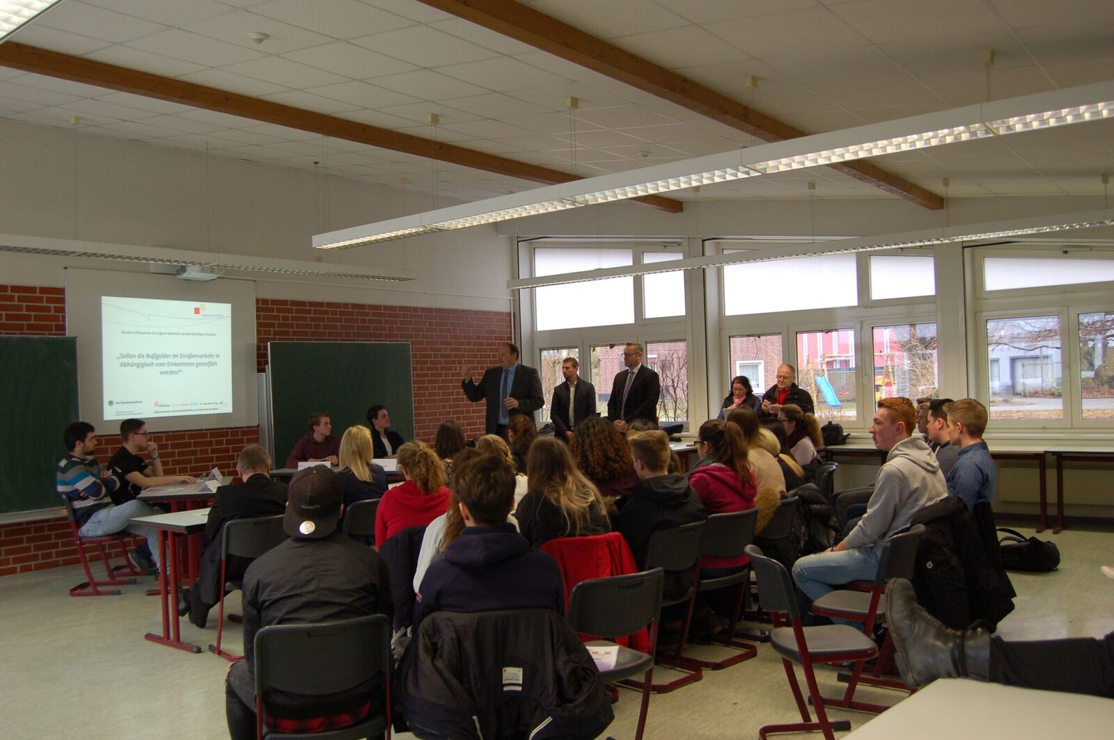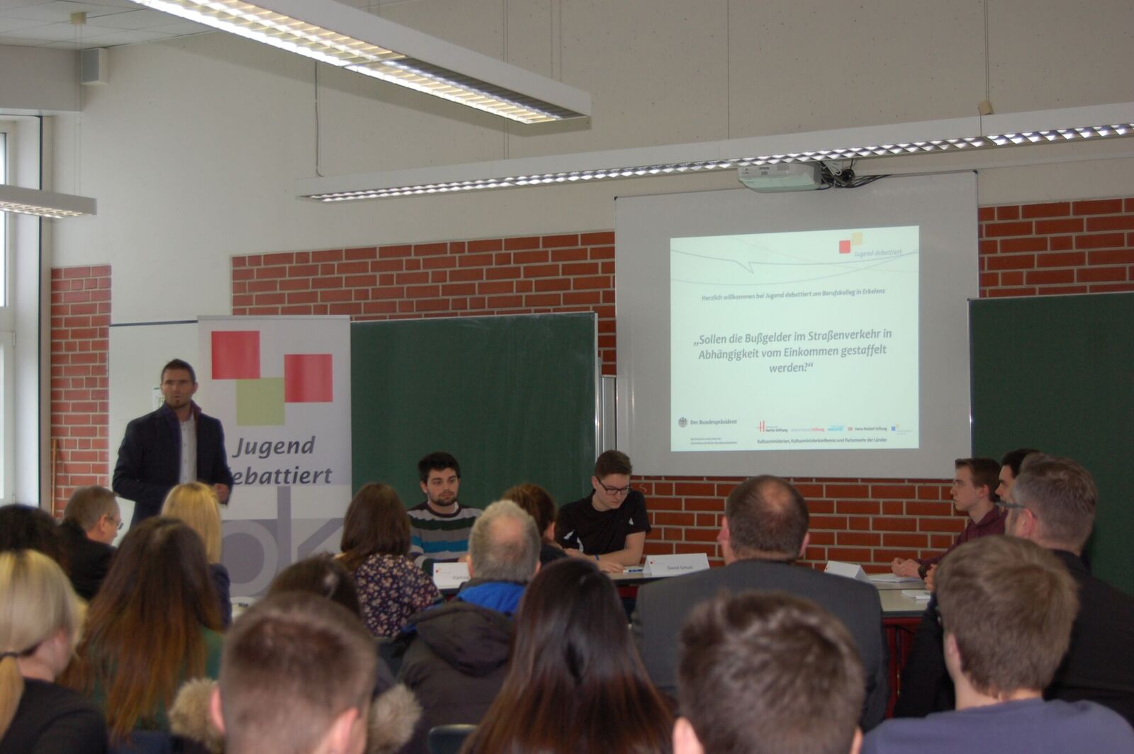 Im Vordergrund der diesjährigen Debatte stand das Thema: „Sollen die Bußgelder im Straßenverkehr in Abhängigkeit vom Einkommen gestaffelt werden?“. Dies wurde in der Finalrunde von den Schülern Marc Kahle (19 Jahre), Hamza Börek (19), Simon Kohnen (17) und David Schulz (18) in einer guten und sachlichen Debatte mit hohem Niveau debattiert. Hierbei hatten David Schulz und Hamza Börek die Positionen „pro“ übernommen, den Standpunkt „contra“ vertraten Marc Kahle und Simon Kohnen.