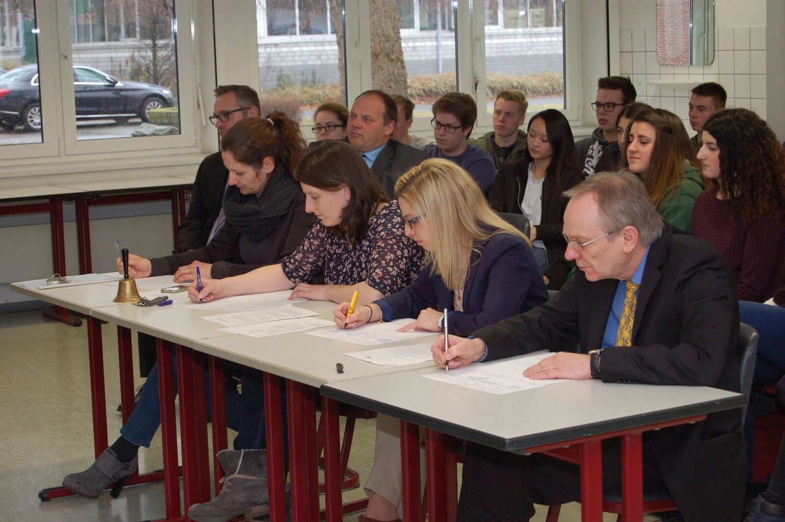 Der Grundstein hierfür ist bereits in der unterrichtlichen Arbeit am Berufskolleg gelegt worden, da die Debattanten hier in verschiedenen Übungsdebatten im Klassenverbund die notwendigen Kenntnisse erlangt haben, um an unserem schulinternen Wettbewerb am 07.02.2017 teilzunehmen. Die Teilnehmerliste war mit 18 Teilnehmerinnen und Teilnehmern so gut gefüllt, dass in vier Gruppen die vier punktbesten Debattanten ermittelt werden mussten, die sich dann im Finale noch einmal vor der vierköpfigen Jury messen durften.