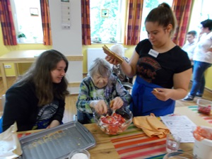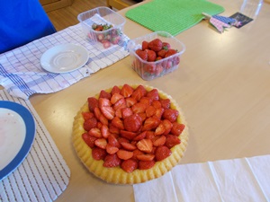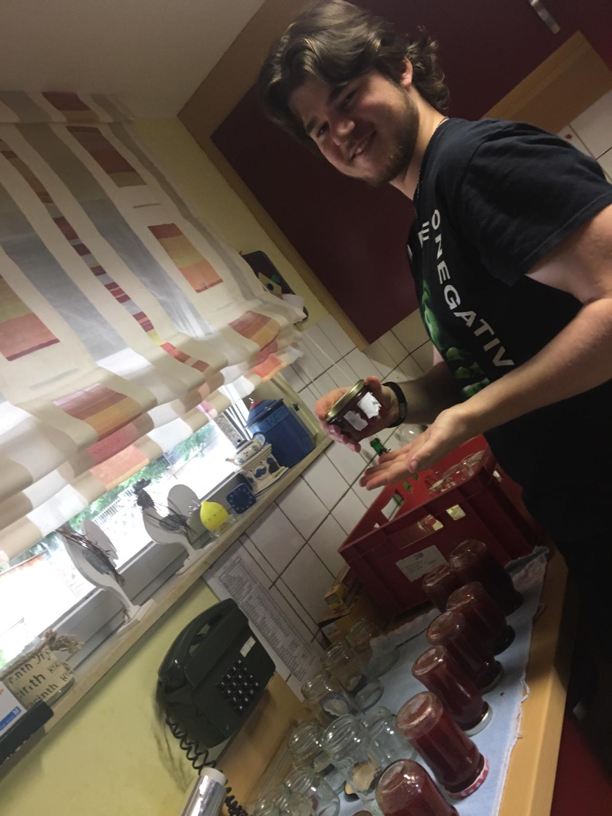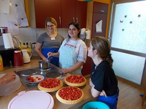 Am Mittwoch, den 05.06.2019, haben wir uns um 8:15 Uhr in der Schulküche getroffen, alles vorbereitet und alle Materialien zusammengepackt. Um 9:10 Uhr sind wir dann gemeinsam zum Hermann-Josef-Altenheim gegangen. Dort haben wir uns in unsere Gruppen aufgeteilt und sind auf die verschiedenen Wohnbereiche gegangen. Dort haben wir die Gerichte mit den Bewohnerinnen und Bewohnern gekocht. Die Bewohnerinnen und Bewohner haben mit uns die Erdbeeren geschnitten und damit den Kuchen belegt, die Erdbeeren auf die Spieße gesteckt, den Vanillepudding mit vorbereitet und die Erdbeeren in den Pudding getan. Auch haben die Bewohnerinnen und Bewohner mitgeholfen, die Etiketten auf die Gläser mit der Erdbeermarmelade zu kleben. Bei der Erdbeerlasagne haben die Bewohnerinnen und Bewohner uns dabei geholfen, die Lasagne zu schichten.