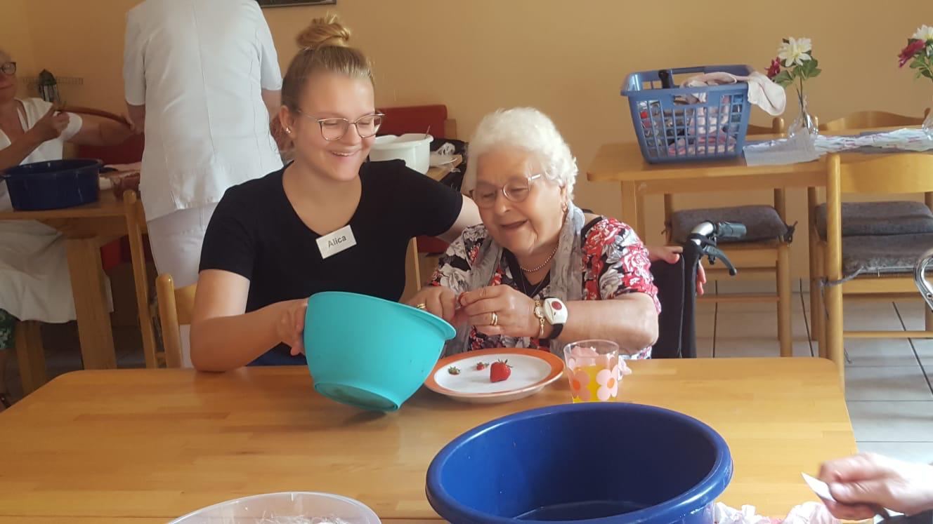 Die angehenden Sozialassistentinnen und Sozialassistenten haben mit Senioren des Hermann-Josef-Altenheims leckere Erdbeergerichte zubereitet