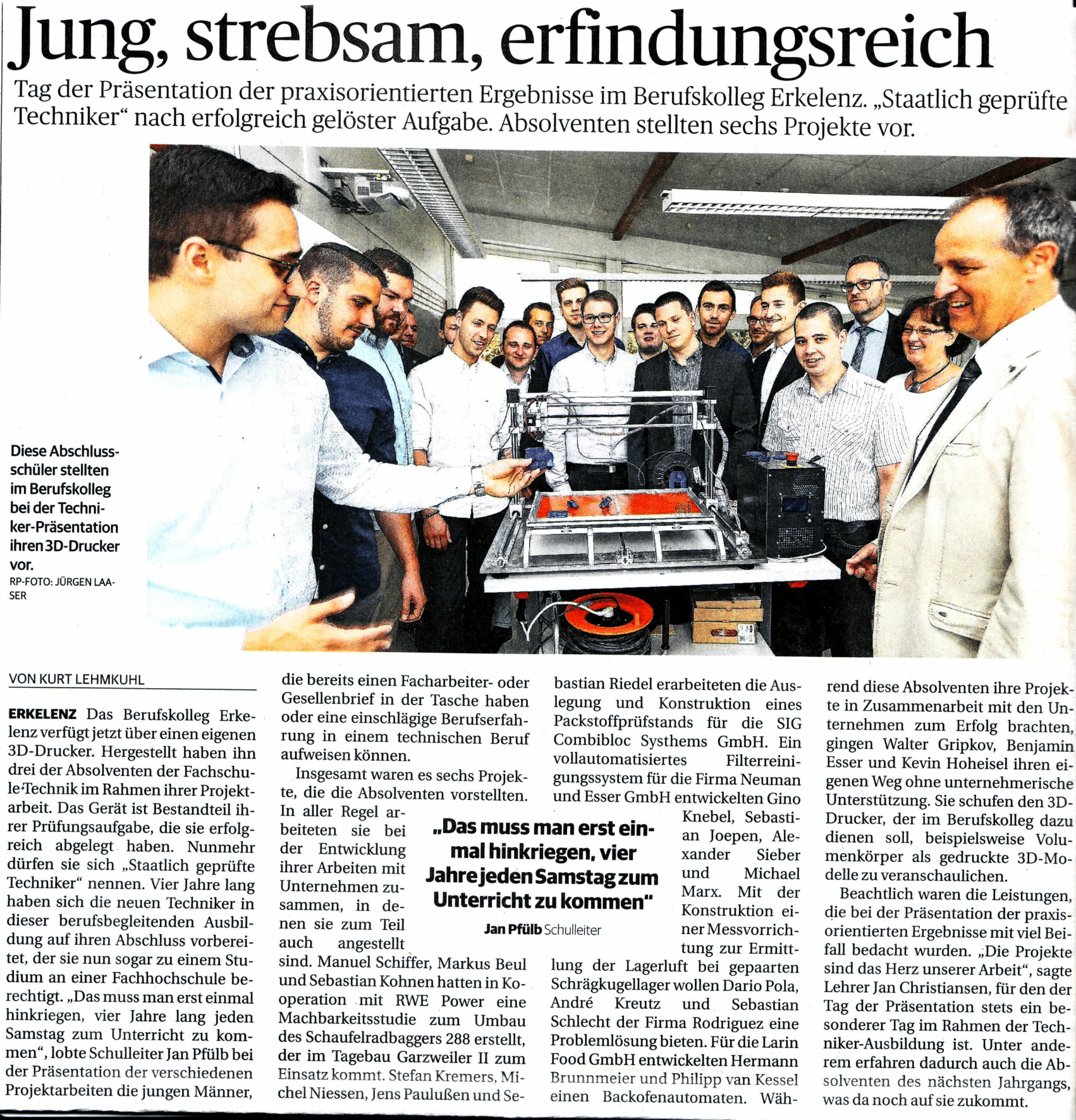 Das Berufskolleg Erkelenz verfügt jetzt über einen eigenen 3D-Drucker. Hergestellt haben ihn drei der Absolventen der Fachschule für Technik im Rahmen ihrer Projektarbeit.